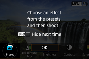 Da biste sačuvali trenutnu postavku na fotoaparatu, pritisnite dugme na ekranu za podešavanje [Creative Assist], a zatim odaberite [OK]. Do tri unapred podešene postavke se mogu sačuvati kao [USER*]. Nakon što su tri postavke sačuvane, postojeća [USER*] unapred podešena postavka mora biti presnimljena da bi se sačuvala nova.