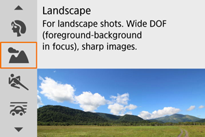 Koristite režim [] (pejzaž) za snimanje ekspanzivnih pejzaža, kako bi sve ostalo u fokusu, od blizu do daleko. Pogodno za jarke plave i zelene boje, i oštrije i jasnije slike.