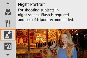 Koristite režim [] (noćni portret) za svetle, prelepe snimke ljudi sa noćnim scenama u pozadini. Imajte na umu da je za snimanje u ovom režimu potreban ugrađeni ili Speedlite blic. Preporučuje se da koristite stativ.