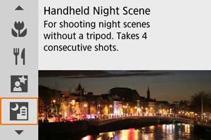 Režim [] (noćna scena pri snimanju iz ruke) omogućava snimanje noćnih scena iz ruke. U ovom režimu snimanja, četiri snimka se snimaju uzastopno za svaku sliku, a rezultirajuća slika je snimljena sa smanjenim podrhtavanjem fotoaparata.