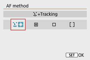 AF tačka prati lica ili oči u fokusu ako ste konfigurisali [Subject to track selection] postavku u okviru prilagođenih kontrola ili u okviru prilagođenih funkcija (C.Fn) ().