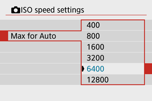Za automatsku ISO brzinu, možete podesiti maksimalno ograničenje ISO brzine u opsegu od ISO 400–12800.