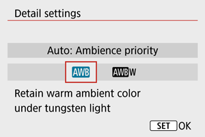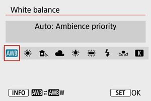 Balans belog (WB) omogućava da beli delovi slike zaista izgledaju belo. U većini situacija, optimalni balans belog se postiže sa automatskim balansom belog [] (sa prioritetom ambijentalnog svetla) ili [
