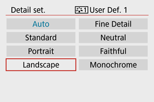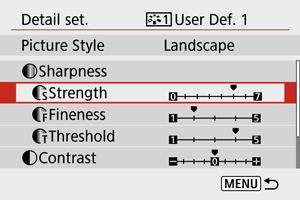 Možete odabrati polazni stil slike poput [Portrait] i [Landscape], prilagoditi ga po želji i sačuvati ga kao korisnički stil slike od [User Def. 1] do [User Def. 3]. Ovo je korisno kada želite da kreirate više stilova slike sa različitim podešavanjima.