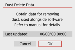 Fotoaparat će primeniti dobijene podatke za brisanje prašine na sve naknadno snimljene slike. Preporučuje se da obnovite podatke za brisanje prašine pre snimanja.