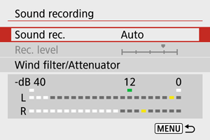 - U režimima osnovne zone, dostupna podešavanja za [Sound recording] su [On] i [Off]. Podesite na [On] za automatsko podešavanje nivoa snimanja.