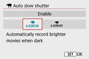 Možete odabrati da snimate svetlije video zapise koji su svetliji nego kada snimate sa opcijom [Disable]. Ovo se postiže automatskim smanjivanjem brzine zatvarača pri snimanju na slabom svetlu.