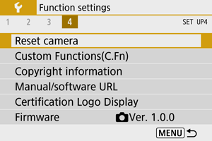 Možete resetovati postavke funkcija snimanja i funkcija u meniju na fotoaparatu na podrazumevane (fabričke) vrednosti.