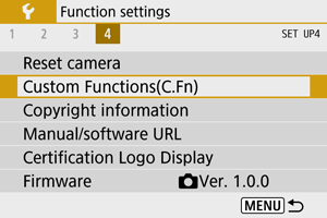 : Reset camera] i odaberite [Custom Functions(C.Fn)] u okviru [Other settings].