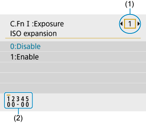 - Trenutna podešavanja prilagođenih funkcija su navedena ispod odgovarajućeg broja funkcije na dnu ekrana (2).