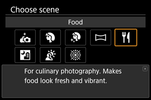 Koristite režim [] (Hrana) za kulinarsko fotografisanje. Fotografija će izgledati sjajno i ukusno. Takođe, crvenkasta nijansa koja nastaje zbog izvora svetlosti će biti potisnuta na slikama snimljenim pod eletričnom sijalicom itd.