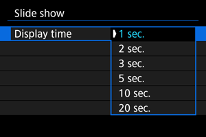 - Podesite [Display time], [Repeat] (ponovljena reprodukcija) i [Transition effect] (efekat pri promeni slika) podešavanja za fotografije.
