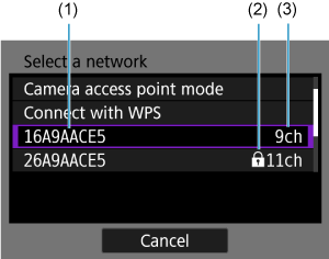 - U Wi-Fi podešavanjima drugog uređaja, odaberite SSID (mrežni naziv) prikazan na ekranu fotoaparata, a zatim unesite lozinku.