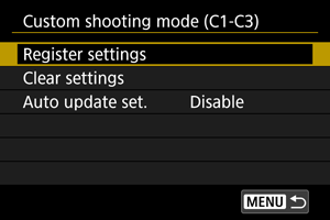 Ako izmenite postavku dok snimate u prilagođenom režimu za snimanje, možete automatski ažurirati prilagođeni režim sa novom postavkom (automatsko ažuriranje). Da biste ovo omogućili, podesite [Auto update set.] na [Enable] u 2. koraku.