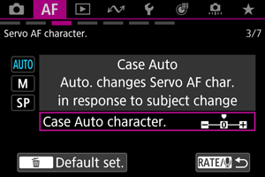 Možete podesiti parametre praćenja servo AF (osetljivost praćenja objekta i praćenje ubrzanja/usporavanja) za objekat i uslove snimanja.