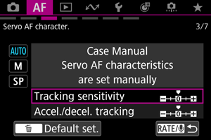 Podesite osetljivost servo autofokusa pri praćenju objekata, odnosno podesite kako će se fokus ponašati ako objekat naglo i drastično promeni brzinu kretanja, kao npr. kod objekata koji naglo kreću ili se zaustavljaju.