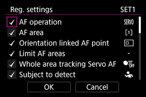 - Sva odabrana AF podešavanja će biti registrovana. Da biste izbrisali ili ponovo odabrali podešavanje, okrećite
