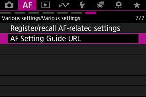 Odaberite [: AF Setting Guide URL] () da biste prikazali QR kôd. Skenirajte QR kôd pomoću pametnog telefona da biste pristupili AF vodiču podešavanja.