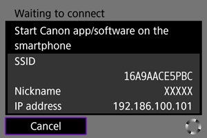 - Nakon što su podešavanja komunikacije završena, poruka na fotoaparatu zahteva da se povežete putem pametnog telefona.