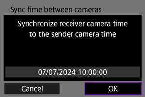 Možete podesiti vreme fotoaparata otpremnika na do 10 fotoaparata prijemnika. Imajte na umu da čak i nakon sinhronizacije postoji mala granica greške između vremena fotoaparata otpremnika i fotoaparata prijemnika (od najviše ±0.05 sekundi).