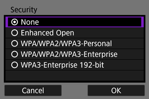 - Ista vrsta bezbednosti mora biti podešena i na drugom uređaju i na fotoaparatu. Pogledajte odeljak Metode autentifikacije i šifrovanja podataka za više detalja o tipovima autentifikacije i šifrovanja.