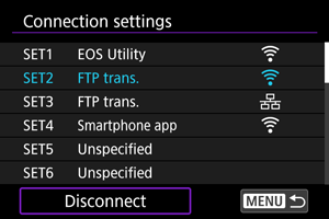 Ako ste odabrali [Enable] i prenos slika se ne obavlja neko vreme, fotoaparat će se odjaviti sa FTP servera i automatski isključiti sa LAN mreže. Veza će ponovo biti automatski uspostavljena kada fotoaparat bude bio spreman za prenos slika. Ako ne želite da se automatski isključite sa LAN mreže, odaberite [Disable].