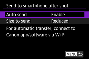 Ako odaberete opciju [Send to smartphone after shot] u okviru postavke [Smartphone settings] možete podesiti veličinu slika za automatsko slanje.