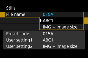 Nazivi datoteka sadrže četiri alfanumerička znaka iza kojih slede četvorocifreni broj datoteke () i ekstenzija datoteke. Možete izmeniti prva četiri alfanumerička znaka, koja su, prema podrazumevanim postavkama, jedinstvena na svakom fotoaparatu i definisana u trenutku isporuke.