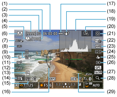 - (10) Indikator nivoa ekspozicije (Iznos korekcije ekspozicije/AEB raspon)