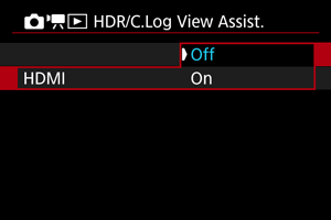 HDR shooting (PQ)] ili u snimanju sa primenjenim prilagođenim slikama () kao što je prikazano na ekranu fotoaparata ili uređaja za prikaz koji nisu HDR povezani preko HDMI-a, može se učiniti tako da nalikuje izgledu na HDR uređajima za prikaz.