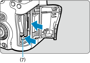 - CFexpress kartica: Pritisnite dugme (7) za otpuštanje kartice da biste je oslobodili.