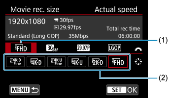 Video zapisi snimljeni pomoću usporenog ili ubrzanog snimanja reprodukuju se usporeno ili ubrzano. Zvuk se ne snima. Podesite brzinu usporenog ili ubrzanog snimanja (brzinu reprodukcije) u okviru postavke [: Movie rec. size].