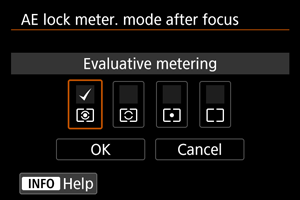Za svaku metodu merenja svetla možete odabrati da li ćete zaključati ekspoziciju (blokada AE) nakon što fotoaparat izoštri objekte sa pojedinačnim autofokusom. Ekspozicija će biti zaključana dok držite okidač pritisnut do pola. Odaberite metodu merenja svetla pri blokadi AE i označite je kvačicom []. Odaberite [OK] da biste registrovali postavku.