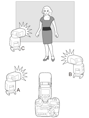 för att tända de tre grupperna A, B och C. Grupp C tänds inte när Speedlites är satta till