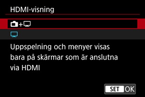 Kamerafunktioner såsom bildvisning och menyvisning visas på den andra enheten via HDMI och inte på kamerans skärm.