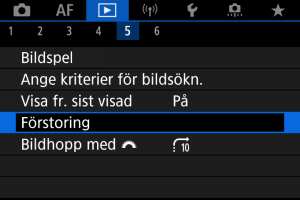 Förstorad bild börjar från AF-punkten i fokus. Om bilden har tagits med manuell fokus börjar den förstorade bilden från skärmens mitt.