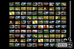 ytterligare motsols växlar skärmen mellan 9, 36 och 100 bilder. Om du vrider inmatningsratten medsols växlar den mellan 100, 36, 9 och 4 bilder och enbildsvisning.