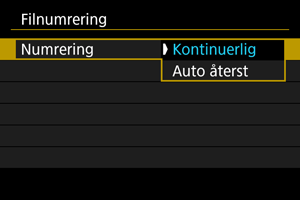 Observera att filnumrering kan fortsätta från alla befintliga bilder på kort eller mappar som du byter till. Om du vill ha kontinuerlig filnumrering rekommenderas du att använda ett nyformaterat kort varje gång.