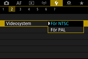 Ställ in videosystemet för TV:n som ska användas för visning. Den här inställningen bestämmer bildhastigheten som är tillgänglig när du spelar in filmer.