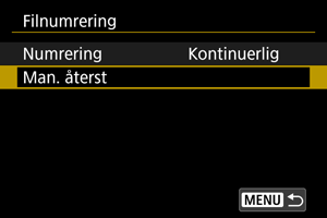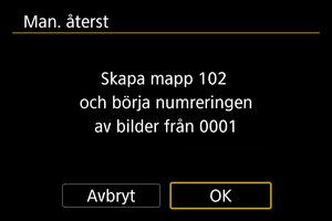 När du återställer filnumreringen manuellt skapas en ny mapp automatiskt och filnumreringen för bilder som sparas i mappen börjar på 0001.