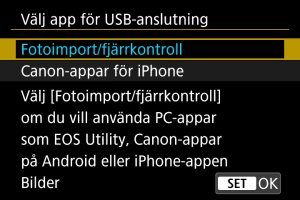 Välj om du vill använda EOS Utility efter att du har anslutit till en dator eller om du använder dedikerade Android-appar eller iOS-versionen av Photos.