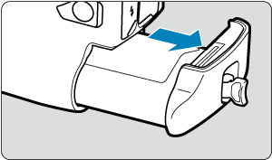- Sätt i batteriet ordentligt hela vägen in och vrid frigöringsvredet för batteriet i pilens riktning.