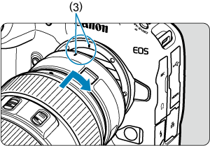 - Passa in de röda punkterna för fastsättning (3) på adaptern och på kameran och vrid objektivet enligt pilen till det klickar fast.