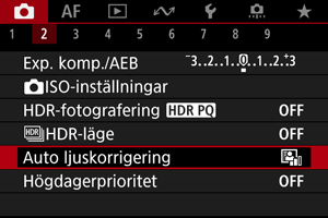 - Om du har valt någon annan inställning än [Av] och försöker uppnå en mörkare exponering med hjälp av exponeringskompensation eller blixtexponeringskompensation kan bilden bli ljus ändå. Ställ in den här funktionen till [Av] om du vill uppnå en mörkare exponering.