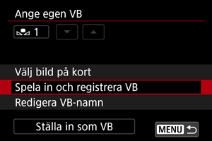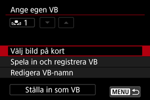 - Välj numret på den registrerade egna vitbalanseringen för att lägga till ett namn på [Ange egen VB]-skärmen.