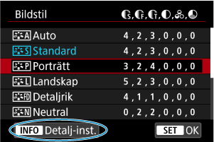 - Genom att välja [Grundinst.] i steg tre kan du återställa parameterinställningar för respektive bildstil till standardinställningarna.