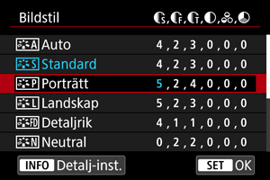- Om du vill ta bilder med den ändrade bildstilen väljer du först den justerade bildstilen och tar sedan bilden.