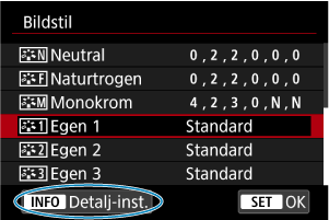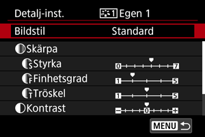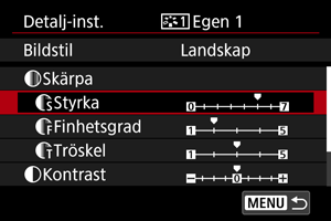 • Om en bildstil redan har registrerats under [Egen *] kan du radera parameterinställningarna för den registrerade bildstilen genom att ändra egen bildstil.