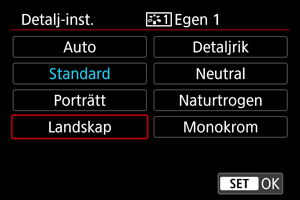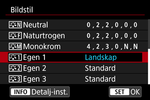 Du kan välja en bildstil såsom [Porträtt] eller [Landskap] samt justera den efter önskemål och registrera den under [Egen 1] – [Egen 3]. Användbart när du skapar flera bildstilar med olika inställningar.