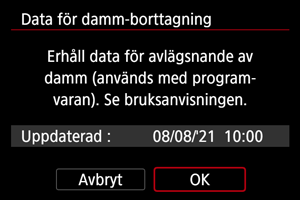 Kameran lägger till de data för dammborttagning som hämtas till alla bilder från och med nu. Hämta data för dammborttagning före bildtagning rekommenderas.